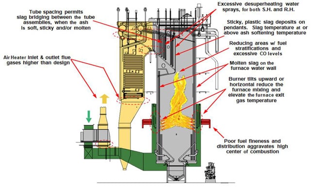 The root cause of furnace slagging is actual very simple, slagging will occur if furnace exit gas temperatures (F.E.G.T.) exceeds the fusion temperature of ash from the coal being fired. To ensure operation without slagging, we typically recommend that F.E.G.T. be 100°F to 150°F below the ash softening temperature. Higher fineness, proper primary (pulverizer) airflow and good fuel balance reduce FEGT by allowing combustion to complete lower in the furnace. When combustion is completed lower in the furnace, the waterwalls absorb a higher amount of total heat release by the fuel and FEGT is reduced.