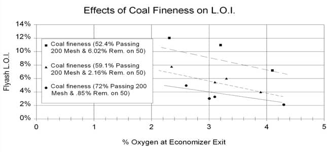 These results will vary between different units due to furnace geometry (mainly furnace retention time), coal properties and firing configuration. Despite these differences, flyash L.O.I. will always be lower with higher fineness levels. Smaller coal particles require less time to burn, minimizing the chance of quenching carbonaceous deposits below their ignition point before leaving the furnace.